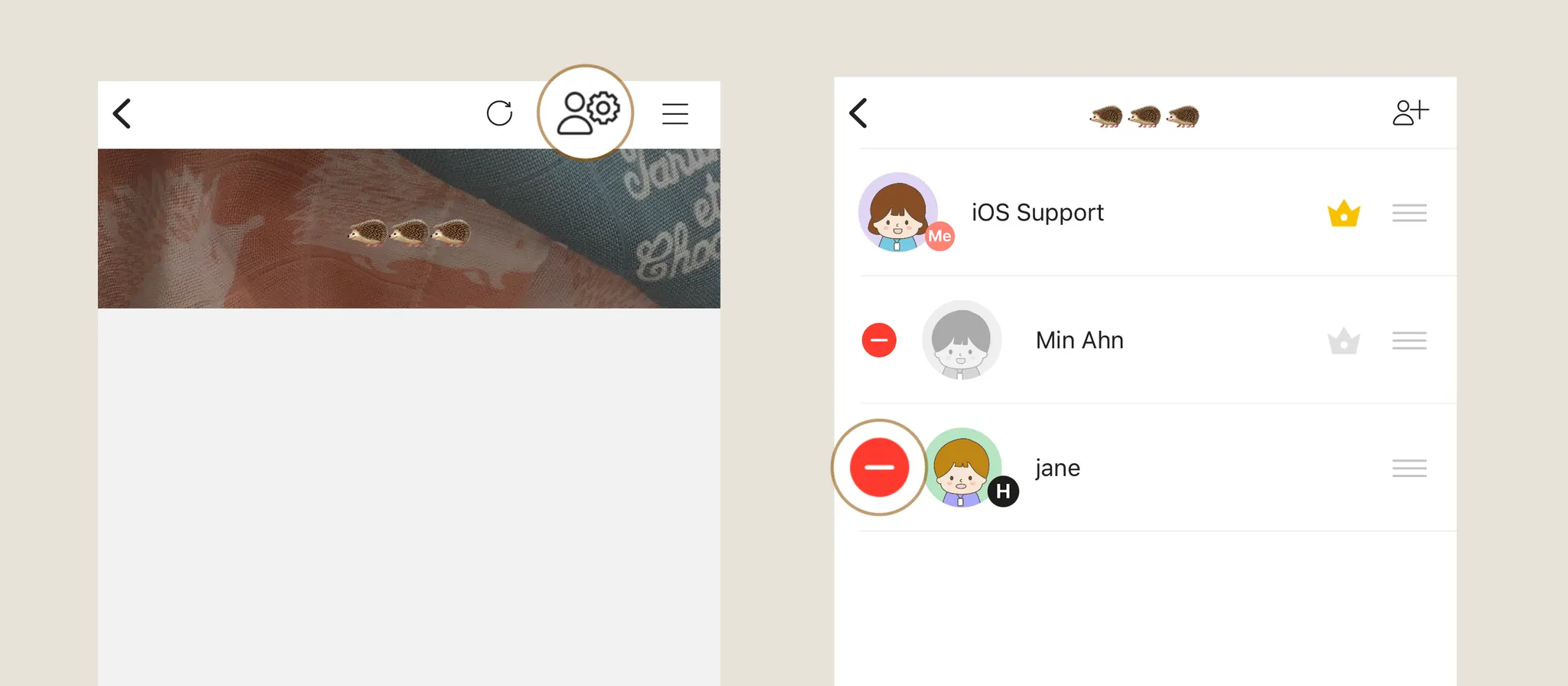 그룹 리더는 멤버를 탈퇴시킬 수 있습니다. 멤버 관리 화면에서 멤버 이름 앞의 [삭제] 아이콘은 선택해 주세요.