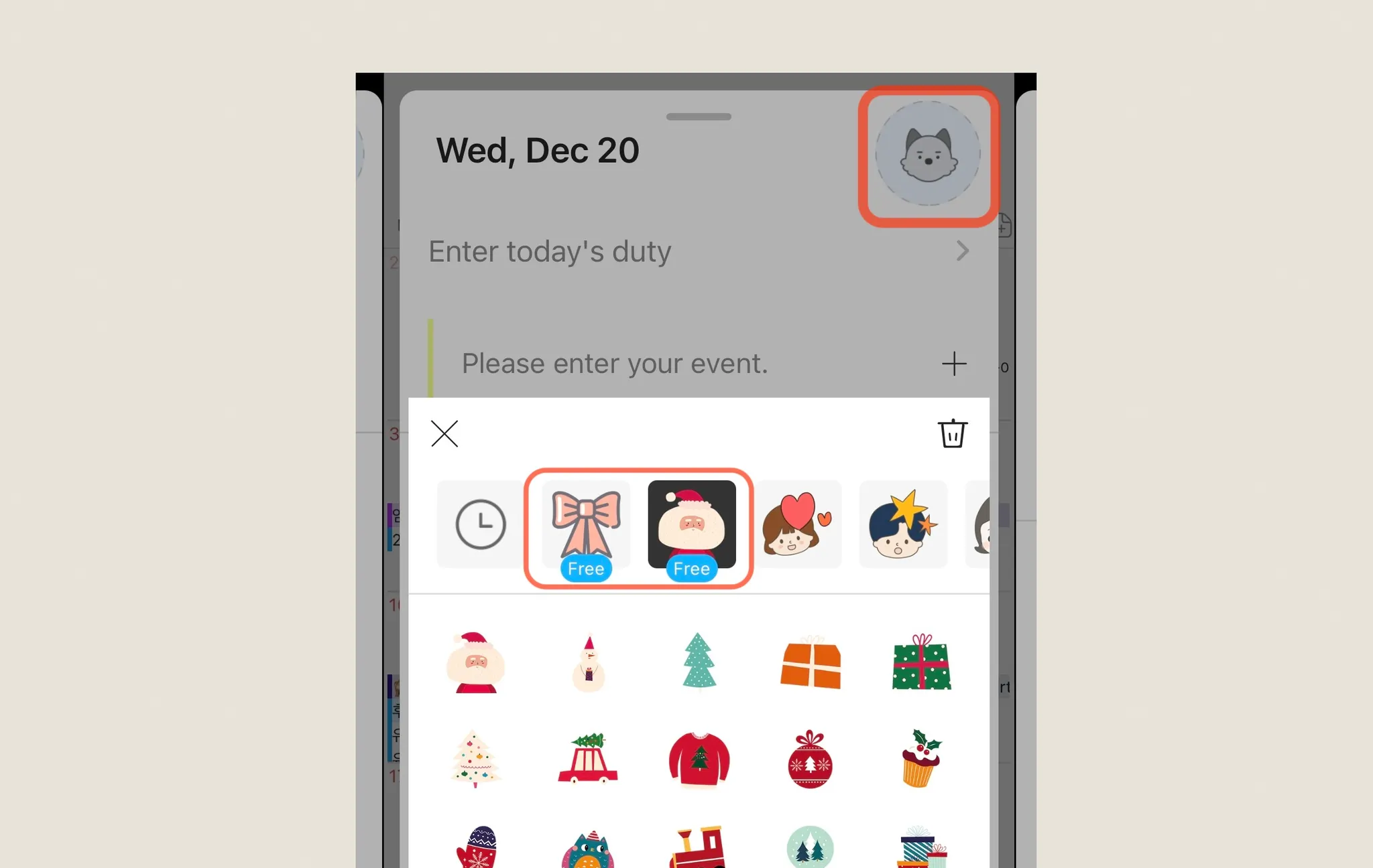 Wählt das 'Aufkleber'-Symbol in der oberen rechten Ecke des [Heute]-Bildschirms, um kostenlose Aufkleber zu sehen.