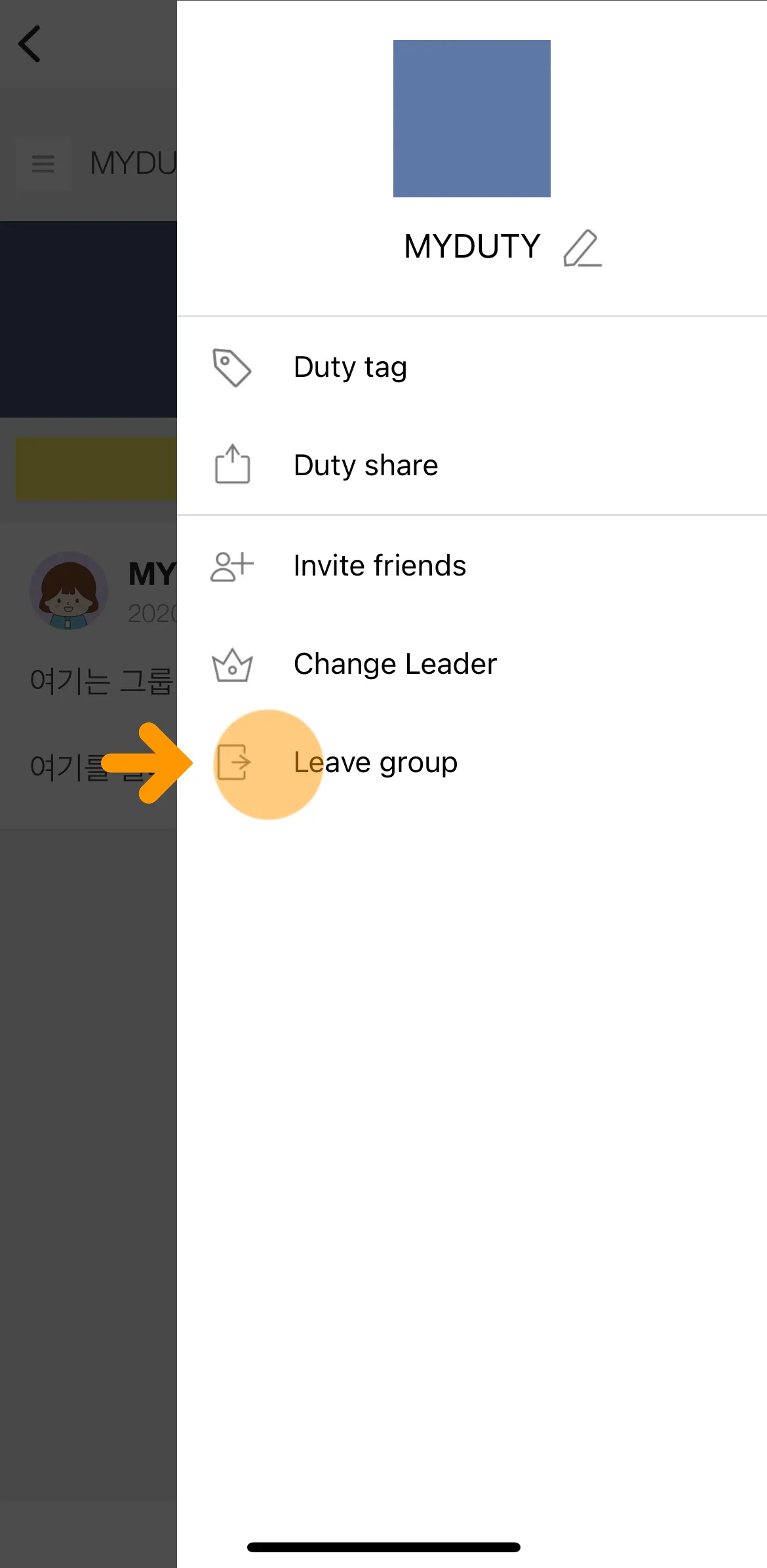 메뉴의 “그룹 탈퇴” 버튼 터치