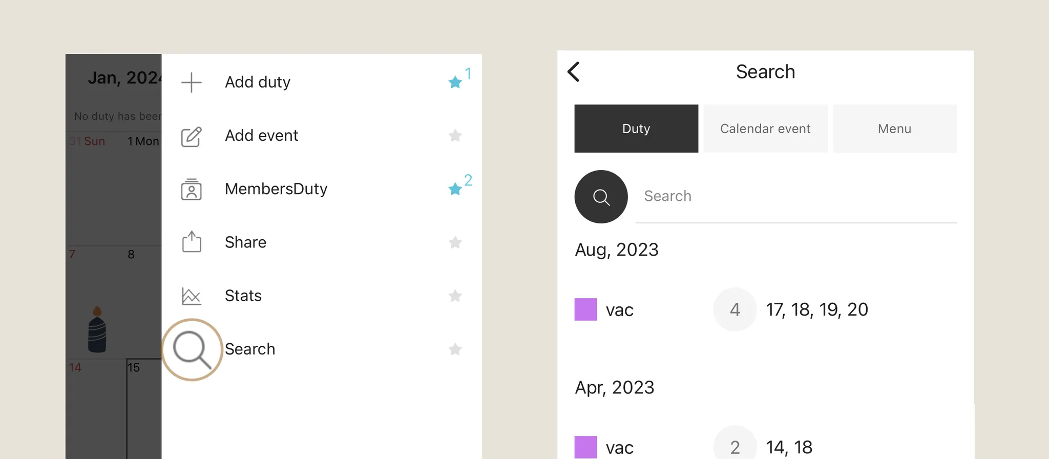 Pour utiliser la fonction de recherche, sélectionnez l'icône de menu (≡) dans le coin supérieur droit de l'écran du calendrier MYDUTY.