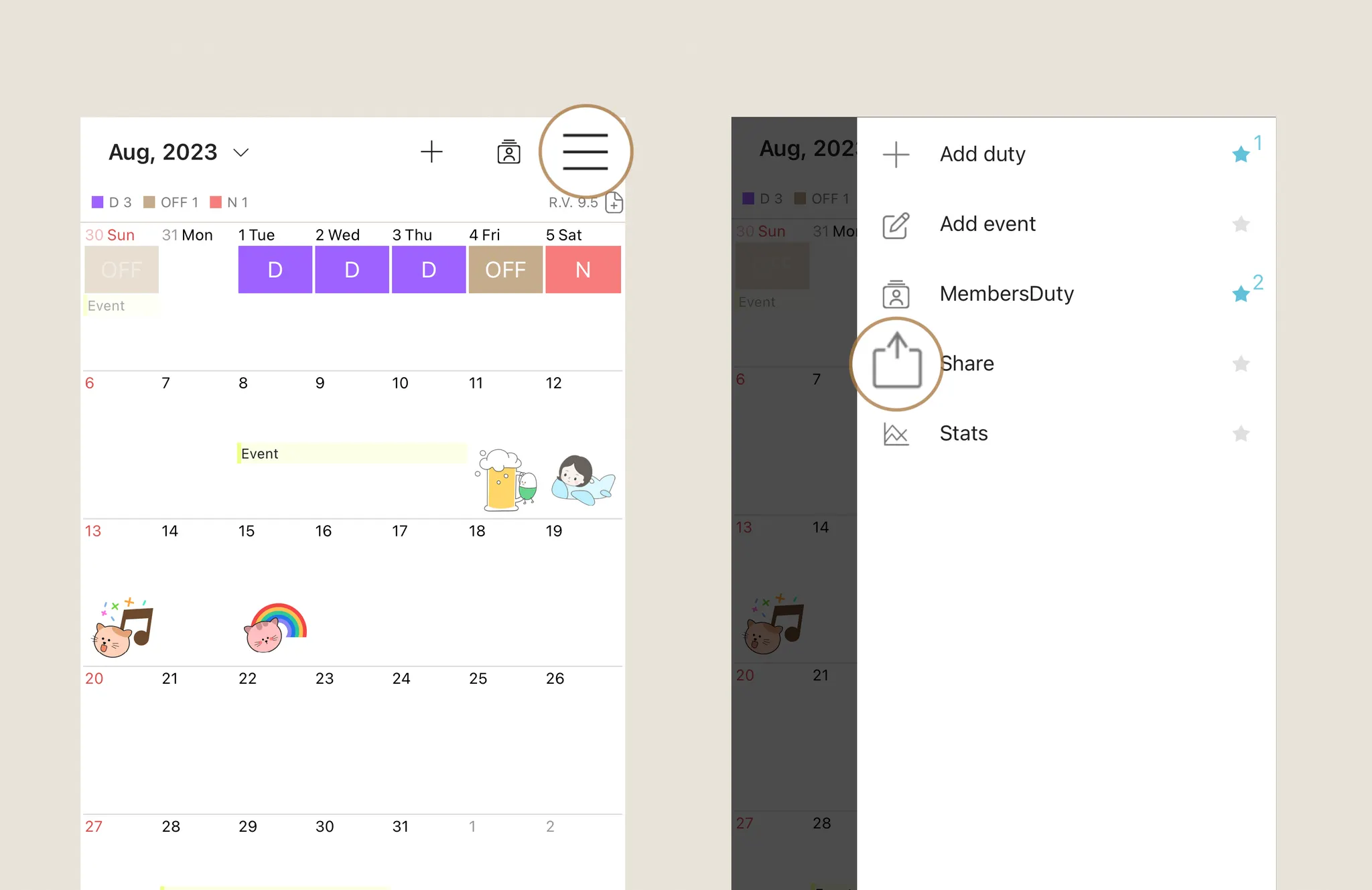 마이듀티 [캘린더] 화면 우측 상단의 메뉴 아이콘을 선택