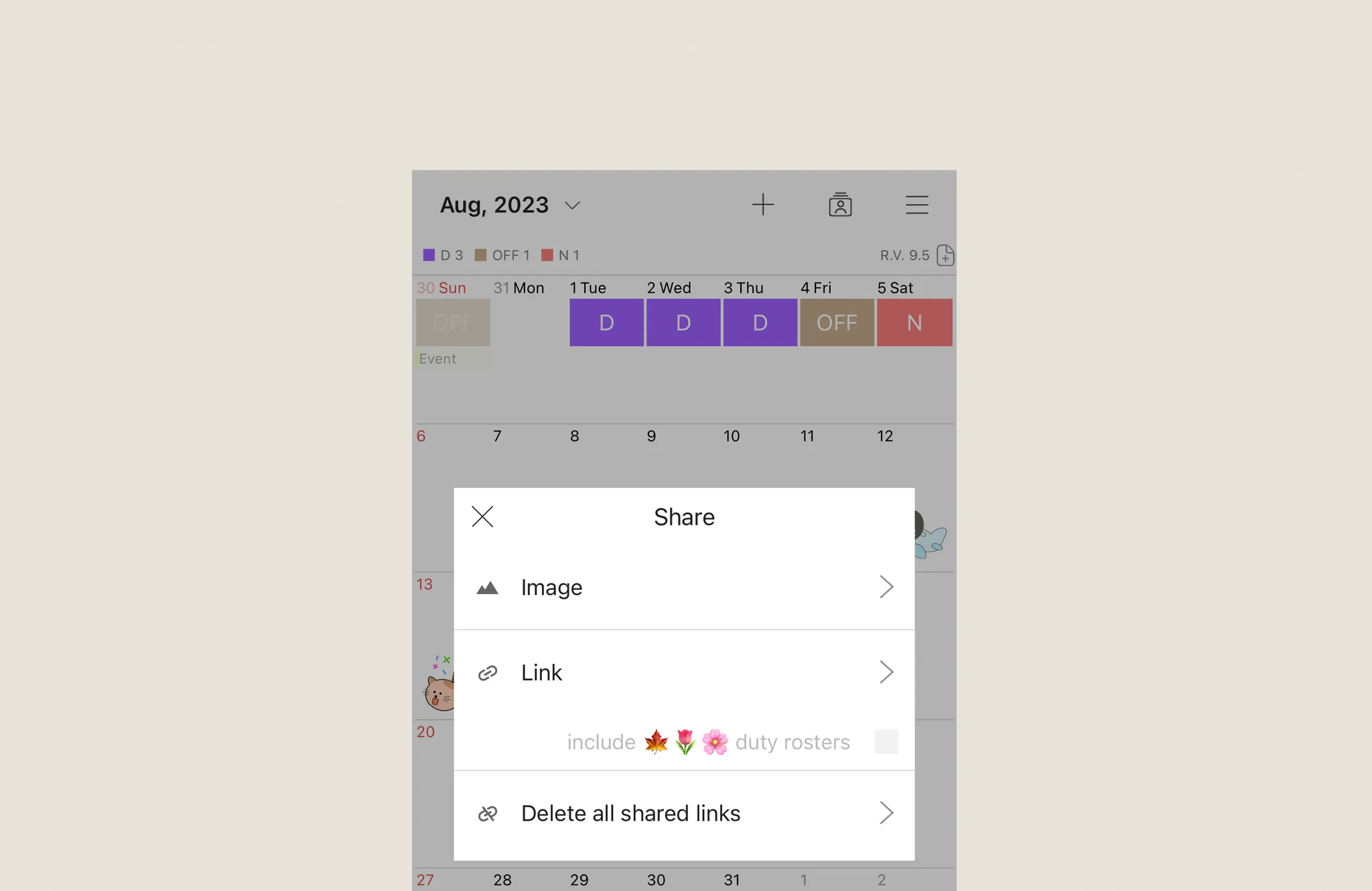 공유 팝업에서 [이미지]를 선택하시면 개인 일정은 보이지 않고 근무만 표시되는 마이듀티 캘린더 화면을 저장하실 수 있습니다.