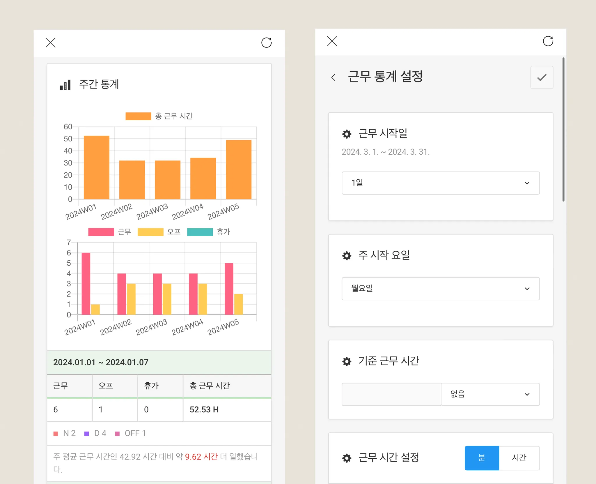근무 통계의 ‘설정’ 화면에서 근무 시작일을 직접 설정하고, 근무 유닛 별로 실제 근무 시간을 입력하시면 더 정확한 통계를 얻을 수 있습니다.